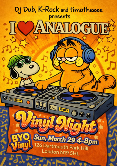 If you fancy a family friendly bring your own vinyl party where you can live out your DJ fantasies then look no further! Sunday 29th Mar. at 126 Dartmouth Park Hill, London N19 5HL 4-8pm.
