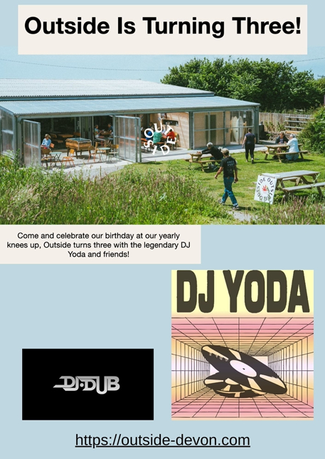 Back in Devonshire with my old mucker DJ Yoda with the good people of Outside - Devon helping them celebrate their third birthday - as well as me and Yoda niceing up the dance you can expect tattoos, skate demos and more!? Saturday 23rd Aug. Doors from 5pm, they'll be serving pizzas from 5pm-8.30pm and the bar will be open all evening - I'm on 7pm-9pm Yoda 9pm-11pm - currently SOLD OUT but check Outside Devon website and/or Insta for updates.